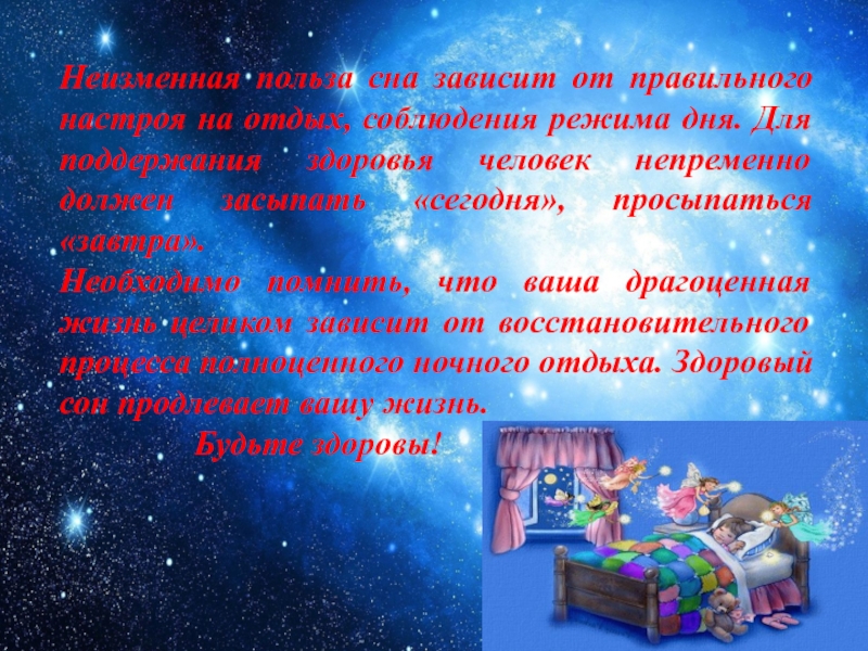Слайд 26Неизменная польза сна зависит от правильного настроя на отдых, соблюдения режима