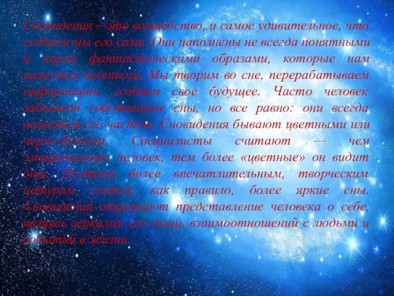 сами. Они наполнены не всегда понятными и порой фантастическими образами, которые нам кажутся нелепыми. Мы творим во сне, перерабатываем информацию, создаем свое будущее. Часто человек забывает собственные сны, но все равно: они всегда являются его частью. Сновидения бывают цветными или черно-белыми. Специалисты считают — чем эмоциональнее человек, тем более «цветные» он видит сны. Поэтому более впечатлительным, творческим натурам снятся, как правило, более яркие сны. Сновидения отражают представление человека о себе, являясь зеркалом его души, взаимоотношений с людьми и событий в жизни.