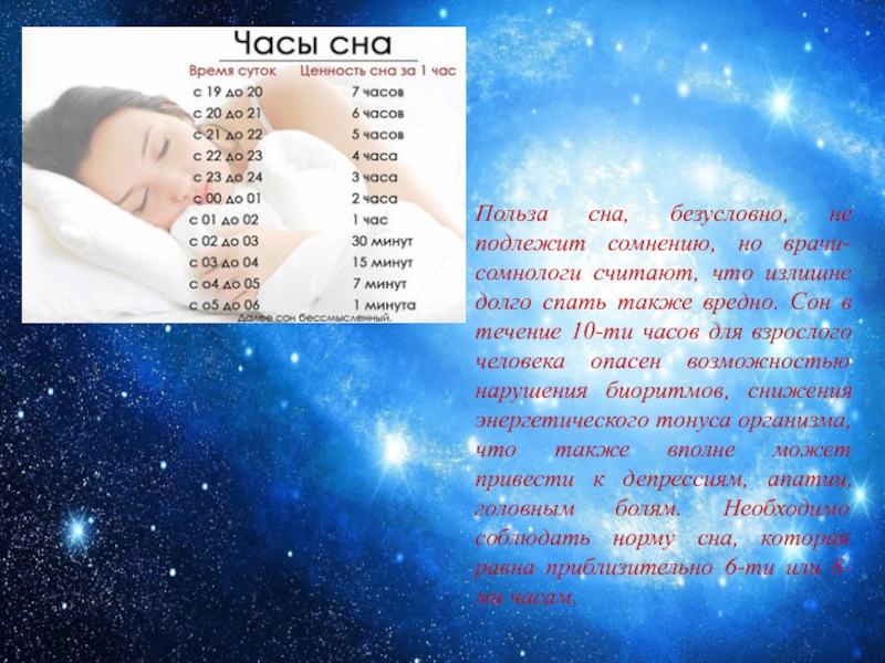 Слайд 12Польза сна, безусловно, не подлежит сомнению, но врачи-сомнологи считают, что излишне