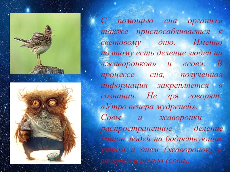 Совы и жаворонки – распространенное деление типов людей на бодрствующих утром и днем (жаворонок) и вечером и ночью (сова).