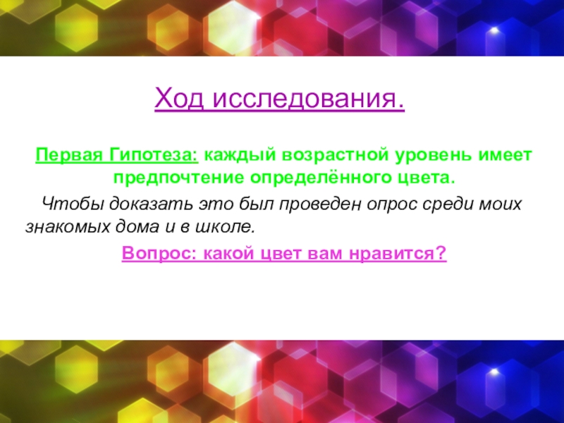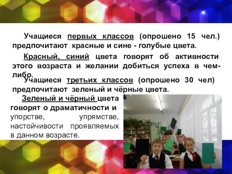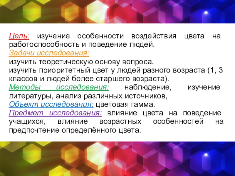 Предмет исследования: влияние цвета на поведение учащихся, влияние возрастных особенностей на предпочтение определённого цвета.