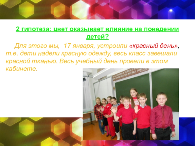 Слайд 172 гипотеза: цвет оказывает влияние на поведении детей?