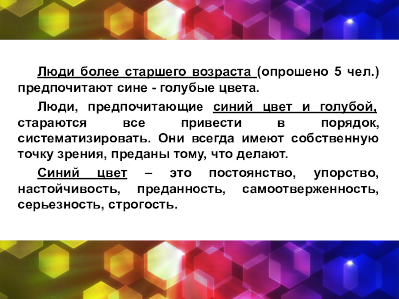 Слайд 15Люди более старшего возраста (опрошено 5 чел.) предпочитают сине - голубые