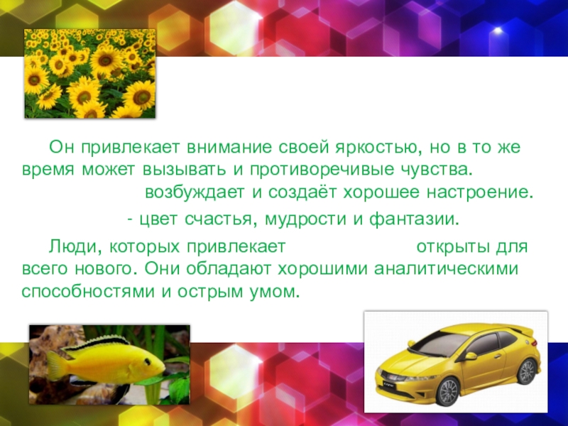 вызывать и противоречивые чувства. Жёлтый цвет возбуждает и создаёт хорошее настроение.