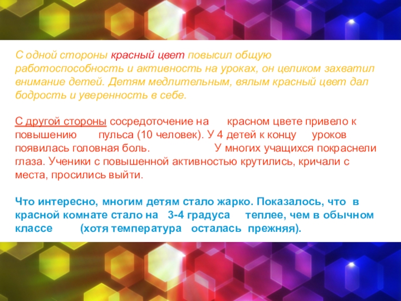 Слайд 18С одной стороны красный цвет повысил общую работоспособность и активность на