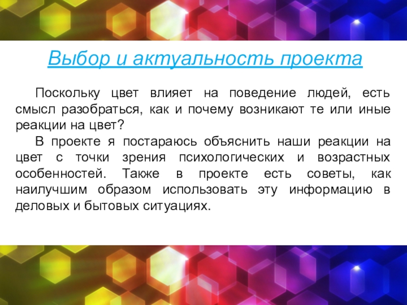 В проекте я постараюсь объяснить наши реакции на цвет с точки зрения психологических и возрастных особенностей. Также в проекте есть советы, как наилучшим образом использовать эту информацию в деловых и бытовых ситуациях.