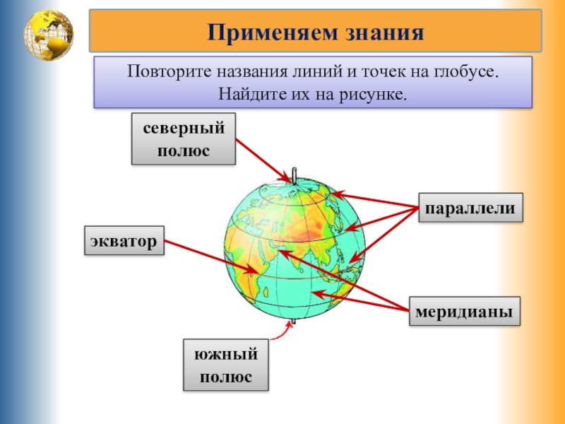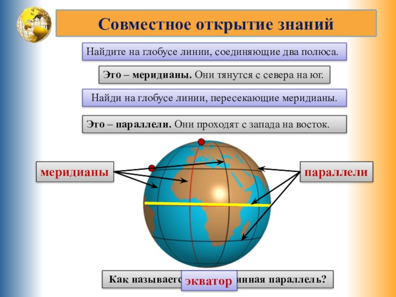 Найди на глобусе линии, пересекающие меридианы.
