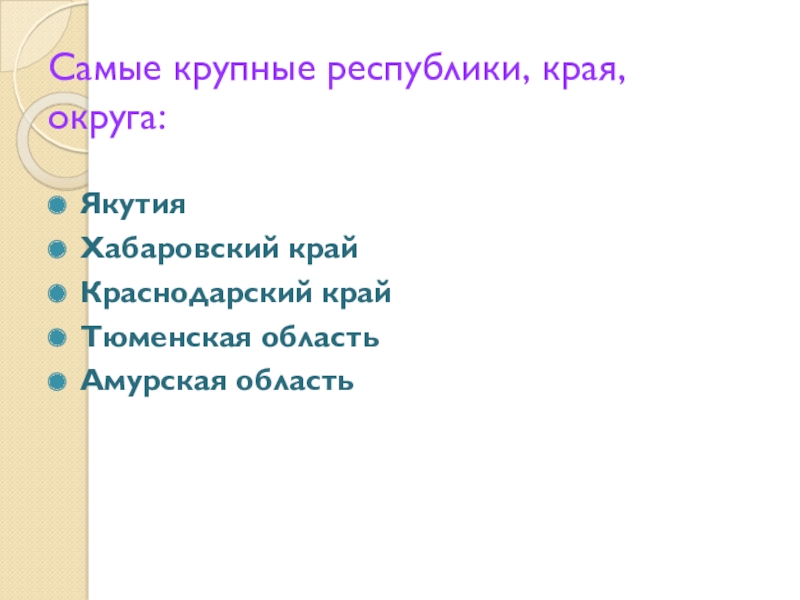 Самые крупные республики, края, округа:ЯкутияХабаровский крайКраснодарский крайТюменская областьАмурская область