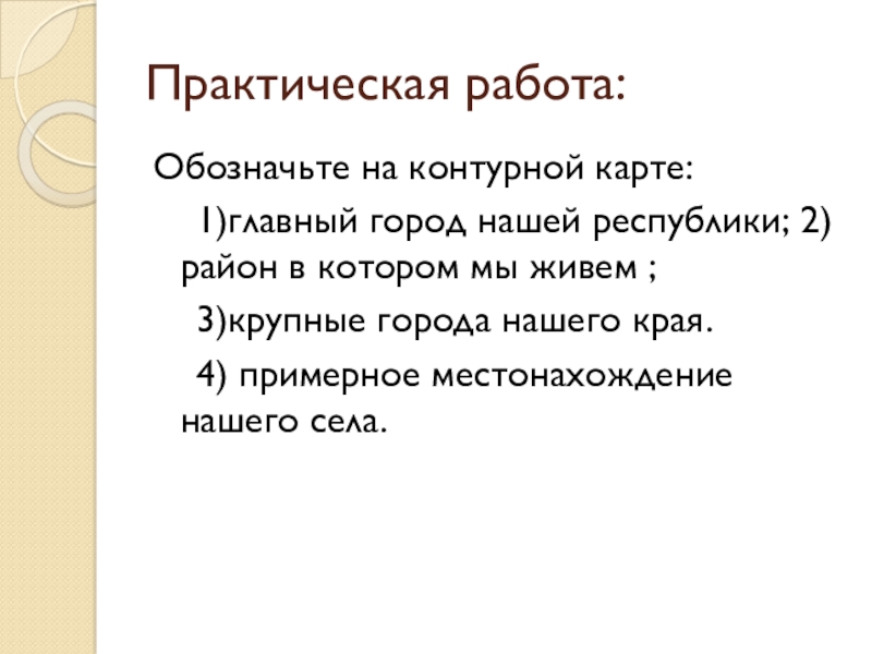 Практическая работа:Обозначьте на контурной карте:  1)главный город нашей республики; 2)район в котором мы живем ;