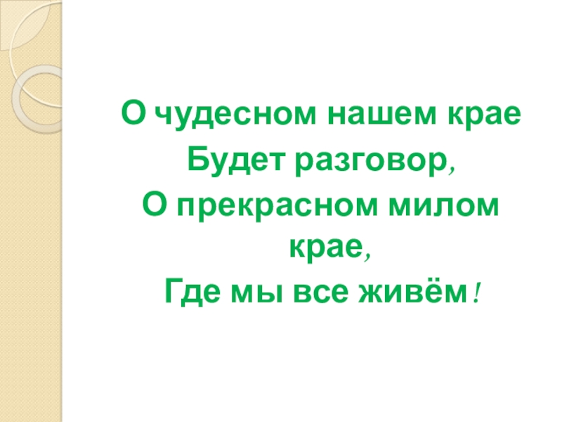 О чудесном нашем краеБудет разговор,О прекрасном милом крае,Где мы все живём!