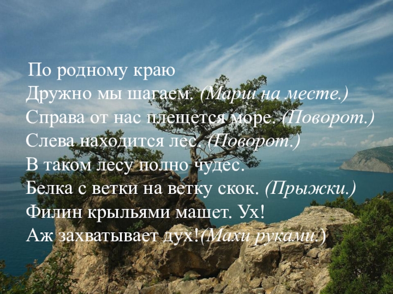 По родному краю Дружно мы шагаем. (Марш на месте.) Справа от нас плещется море. (Поворот.) Слева находится