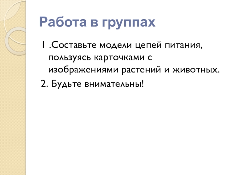 Работа в группах1 .Составьте модели цепей питания, пользуясь карточками с изображениями растений и животных.2. Будьте внимательны!