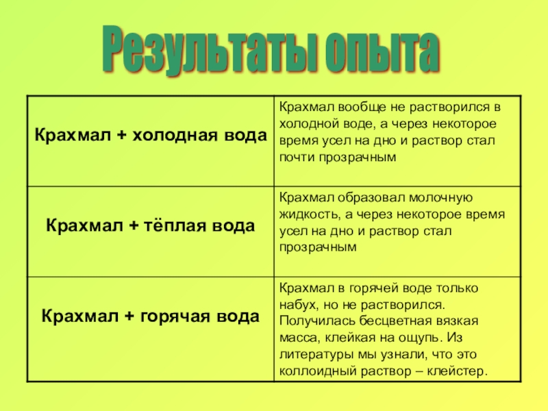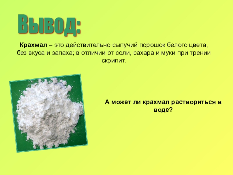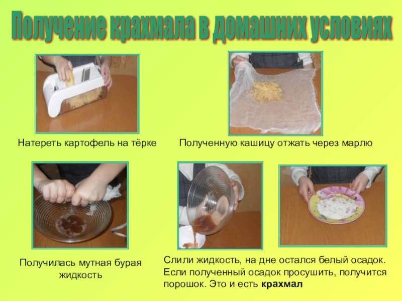 Слили жидкость, на дне остался белый осадок. Если полученный осадок просушить, получится порошок. Это и есть крахмал