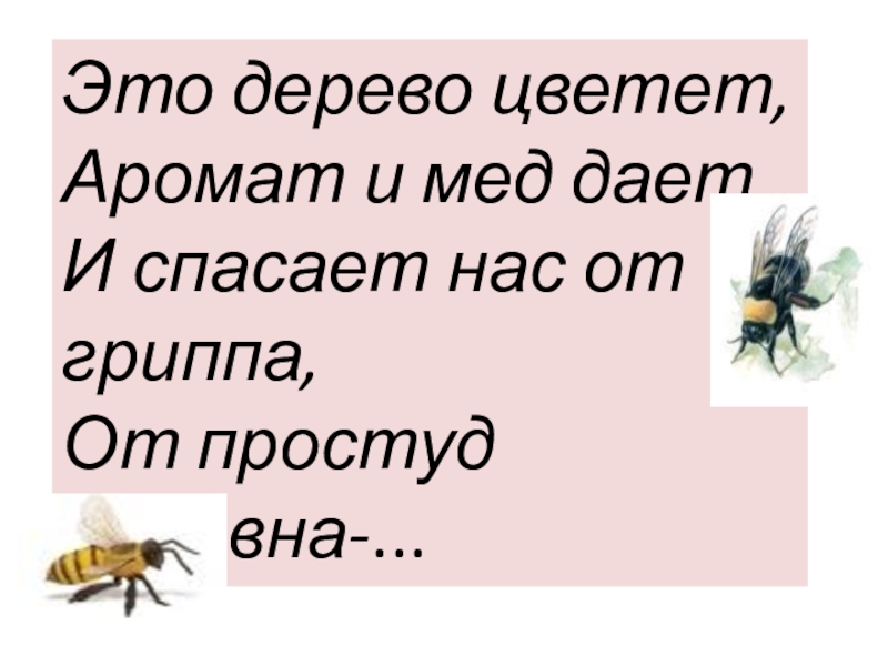 Слайд 22Это дерево цветет, Аромат и мед дает. И спасает нас от гриппа, От простуд