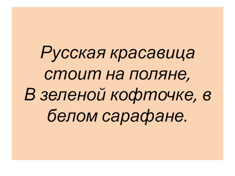 Слайд 2Русская красавица стоит на поляне, В зеленой кофточке, в белом сарафане.