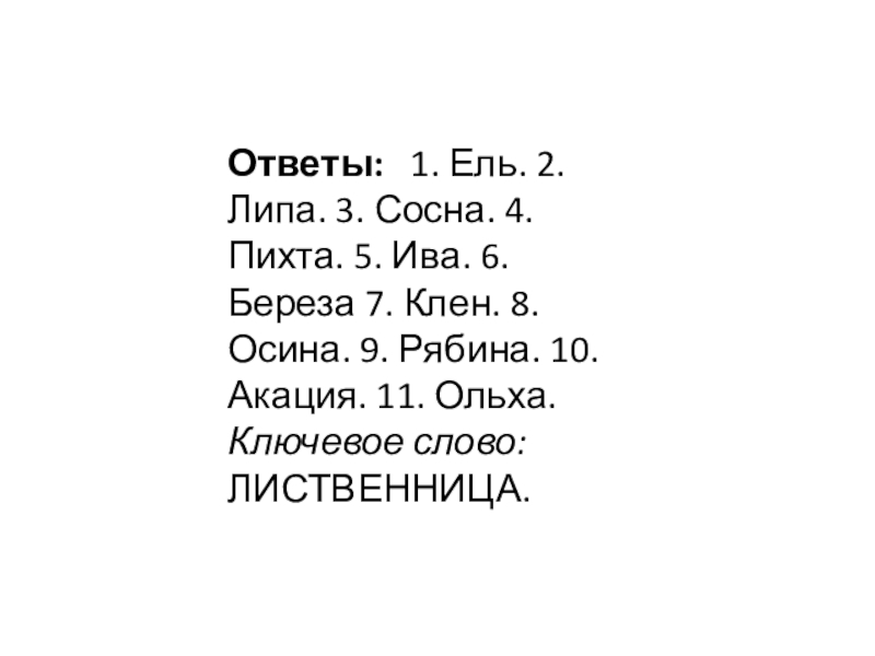 Слайд 26Ответы:   1. Ель. 2. Липа. 3. Сосна. 4. Пихта. 5. Ива.