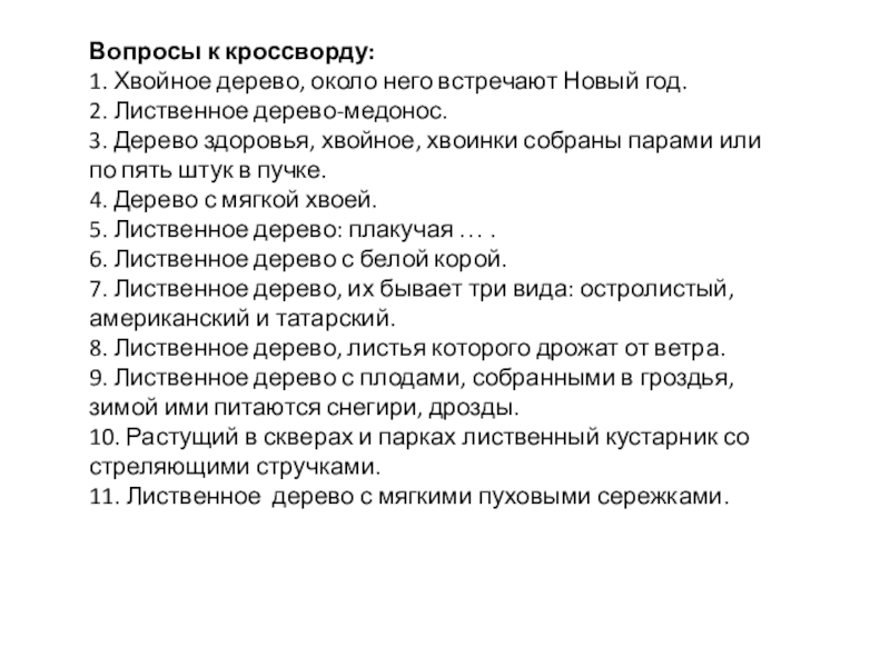 Вопросы к кроссворду:1. Хвойное дерево, около него встречают Новый год. 2. Лиственное дерево-медонос. 3. Дерево здоровья, хвойное,