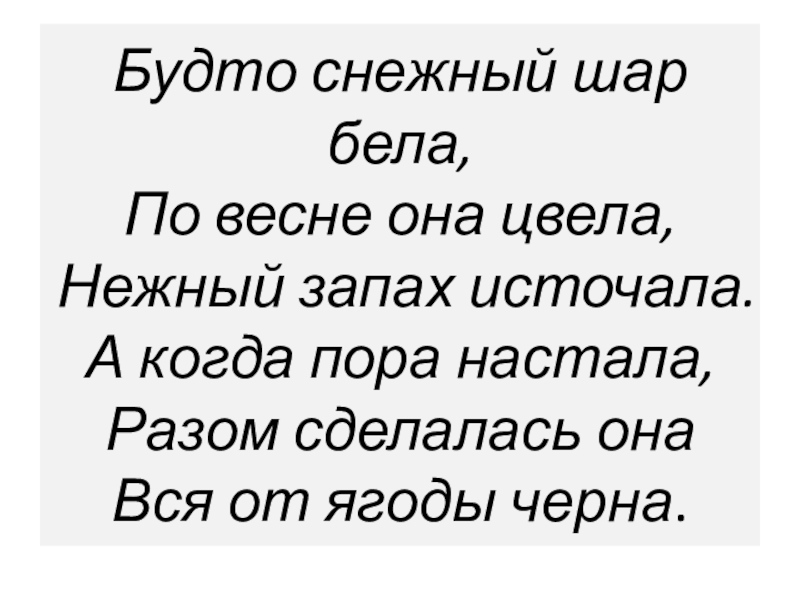 Будто снежный шар бела,  По весне она цвела,  Нежный запах источала.  А когда пора