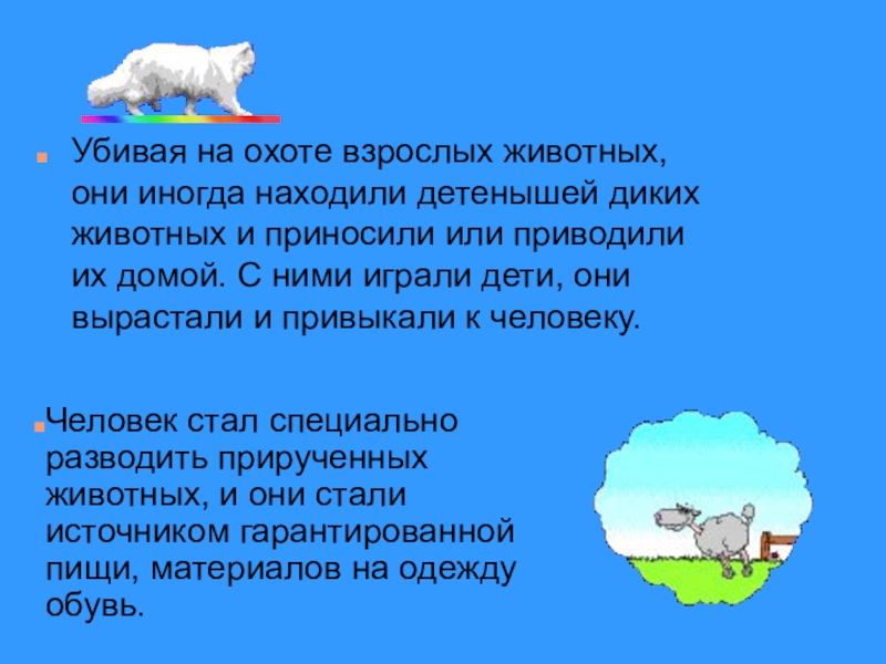 Человек стал специально разводить прирученных животных, и они стали источником гарантированной пищи, материалов на одежду обувь.