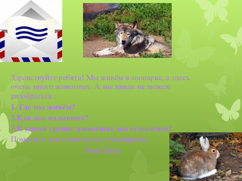 Здравствуйте ребята! Мы живём в зоопарке, а здесь очень много животных. А мы никак не можем разобраться