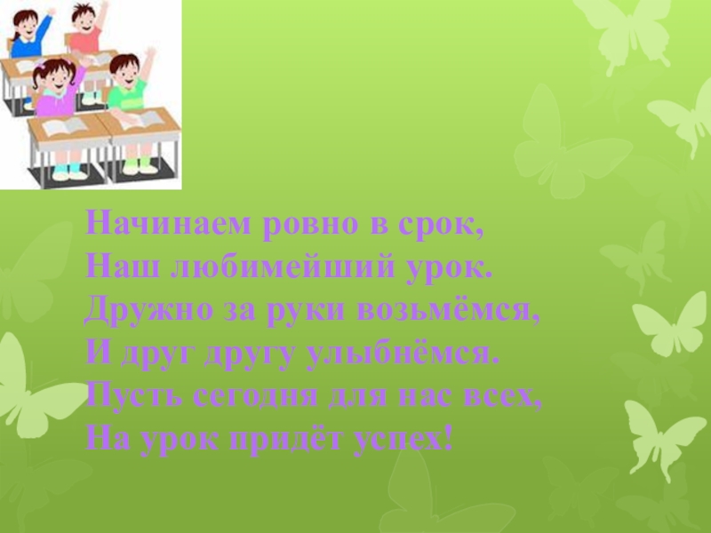 Начинаем ровно в срок, Наш любимейший урок. Дружно за руки возьмёмся,И друг другу улыбнёмся. Пусть сегодня для нас всех, На урок придёт успех!