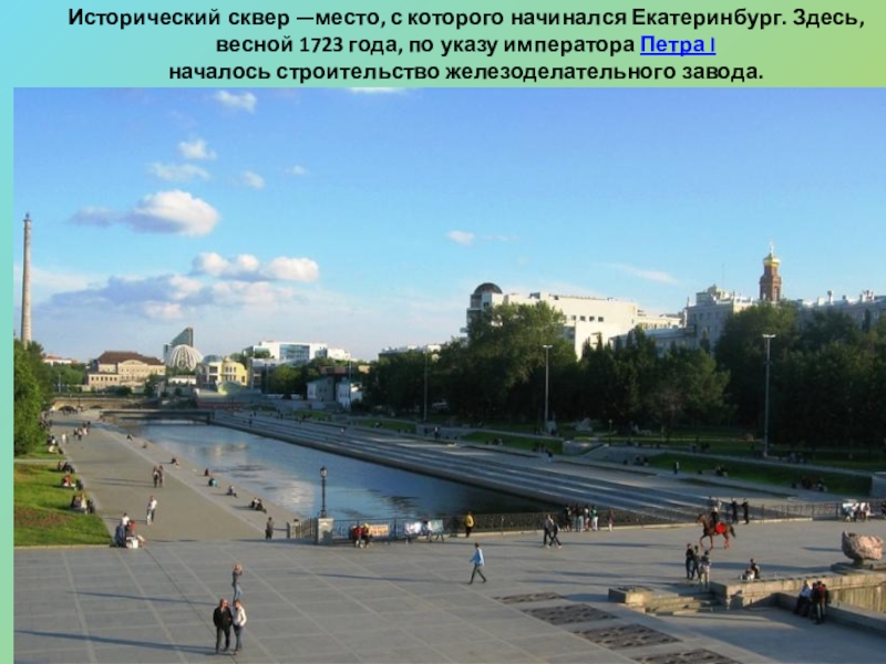 Исторический сквер —место, с которого начинался Екатеринбург. Здесь, весной 1723 года, по указу императора Петра I началось строительство железоделательного