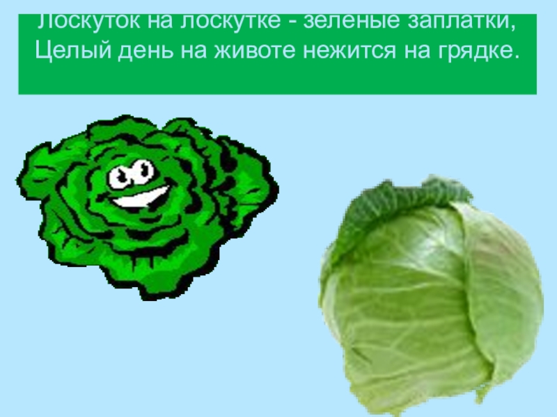 Слайд 7Лоскуток на лоскутке - зеленые заплатки, Целый день на животе нежится на