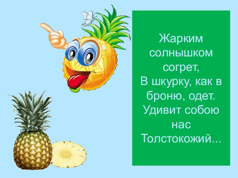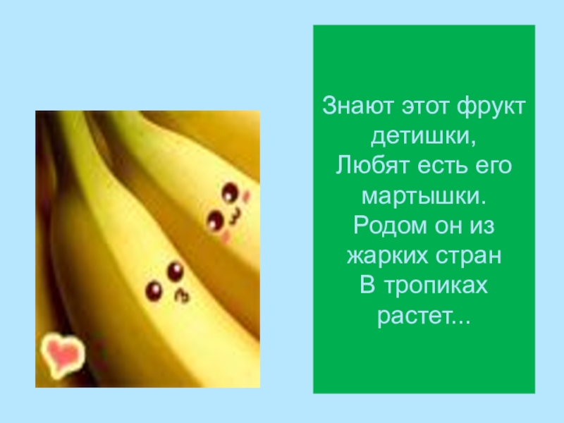 Слайд 5Знают этот фрукт детишки,  Любят есть его мартышки.  Родом он из жарких стран  В