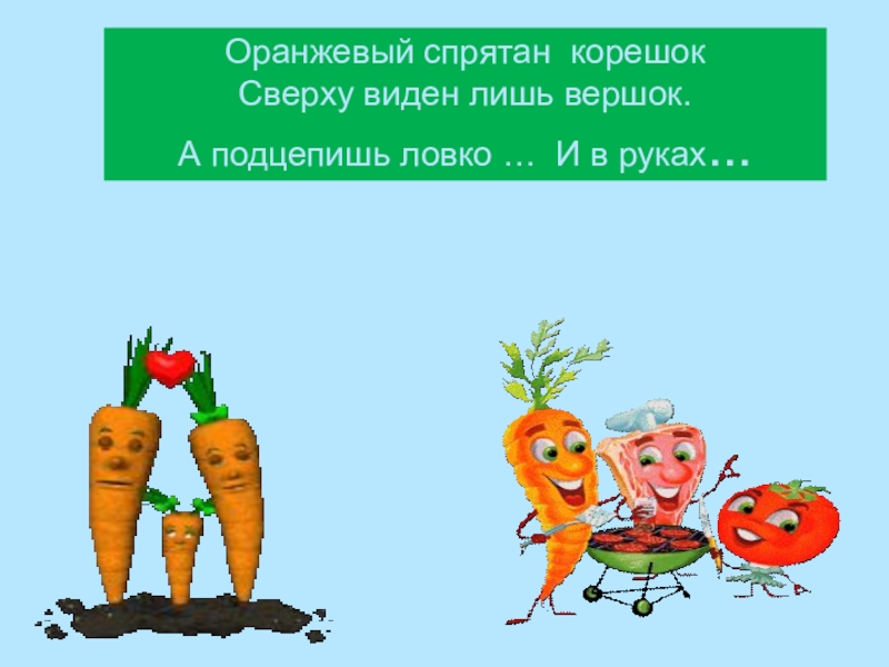 Слайд 10Оранжевый спрятан  корешок Сверху виден лишь вершок. А подцепишь ловко … И в