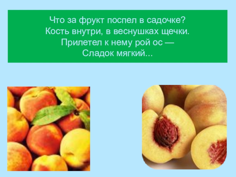 Слайд 3Что за фрукт поспел в садочке? Кость внутри, в веснушках щечки. Прилетел к