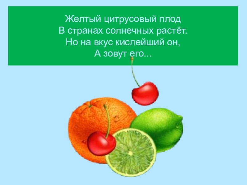 Слайд 9Желтый цитрусовый плод  В странах солнечных растёт.  Но на вкус кислейший он,  А зовут