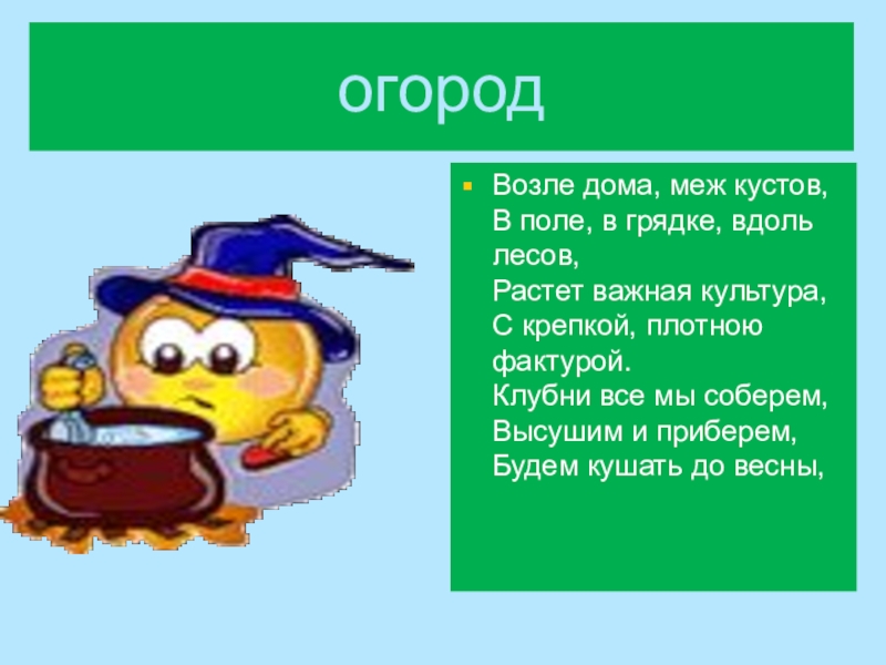 огородВозле дома, меж кустов, В поле, в грядке, вдоль лесов, Растет важная культура, С крепкой, плотною фактурой.