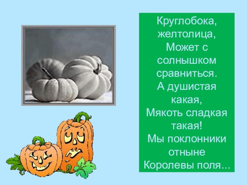 Слайд 6Круглобока, желтолица,  Может с солнышком сравниться.  А душистая какая,  Мякоть сладкая такая!  Мы поклонники отныне  Королевы