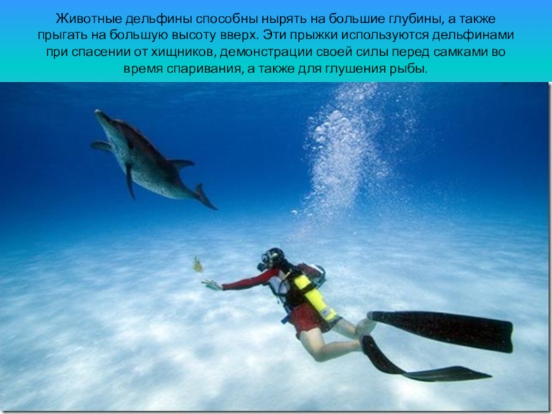 Слайд 11Животные дельфины способны нырять на большие глубины, а также прыгать на