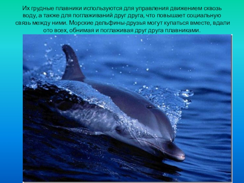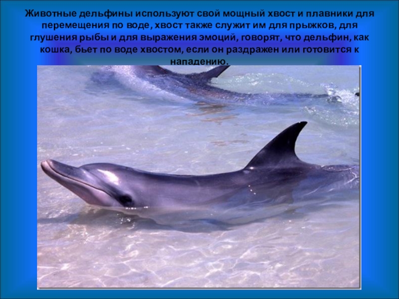 Слайд 6Животные дельфины используют свой мощный хвост и плавники для перемещения по