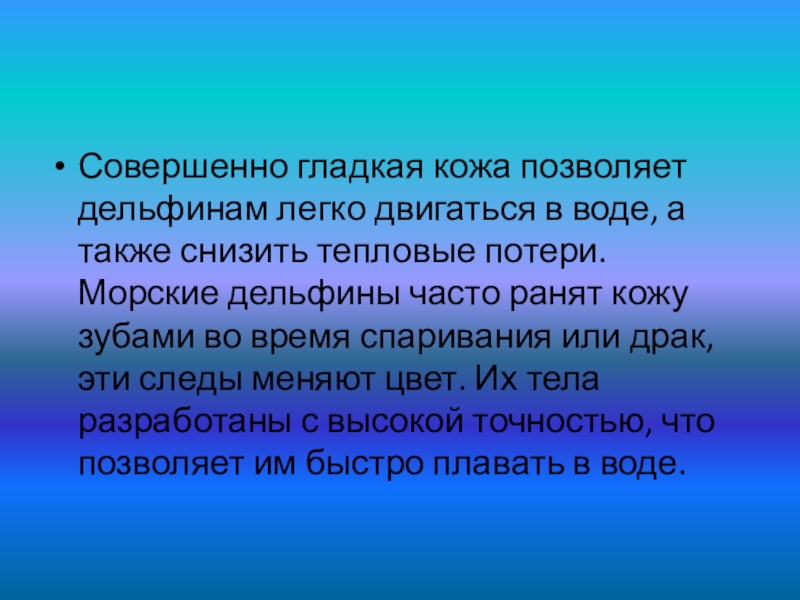 Слайд 10Совершенно гладкая кожа позволяет дельфинам легко двигаться в воде, а также