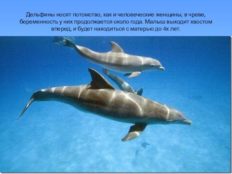 Слайд 13Дельфины носят потомство, как и человеческие женщины, в чреве, беременность у