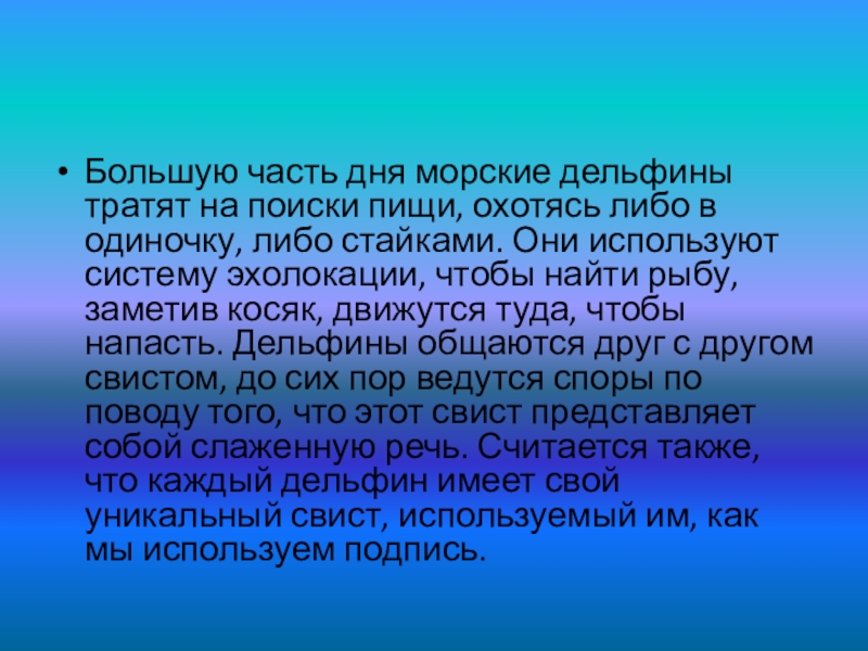 Слайд 16Большую часть дня морские дельфины тратят на поиски пищи, охотясь либо