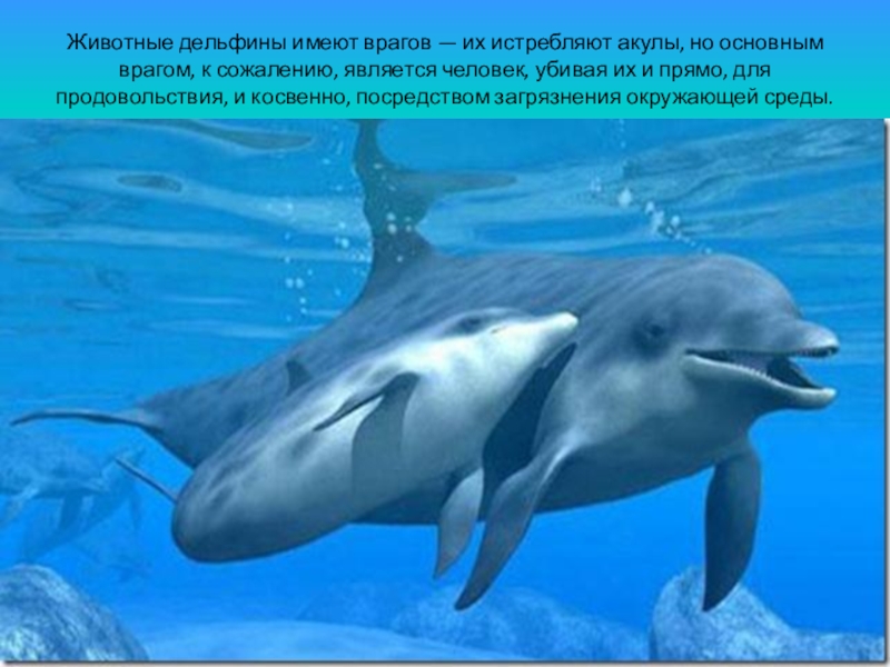 Слайд 15Животные дельфины имеют врагов — их истребляют акулы, но основным врагом,