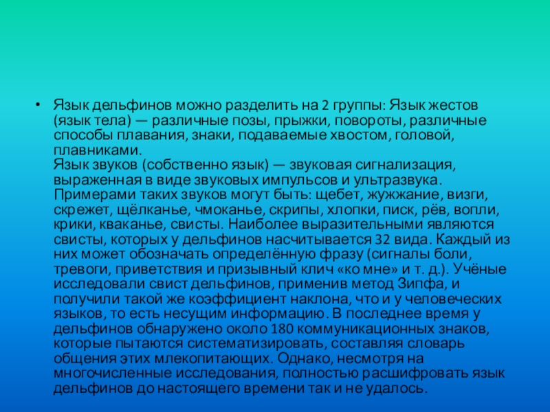 Слайд 18Язык дельфинов можно разделить на 2 группы: Язык жестов (язык тела)