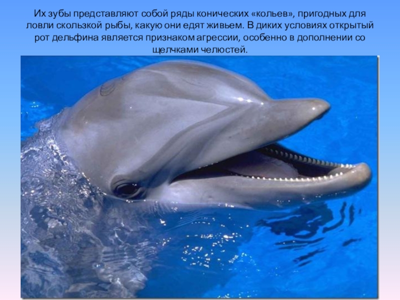 рыбы, какую они едят живьем. В диких условиях открытый рот дельфина является признаком агрессии, особенно в дополнении со щелчками челюстей.