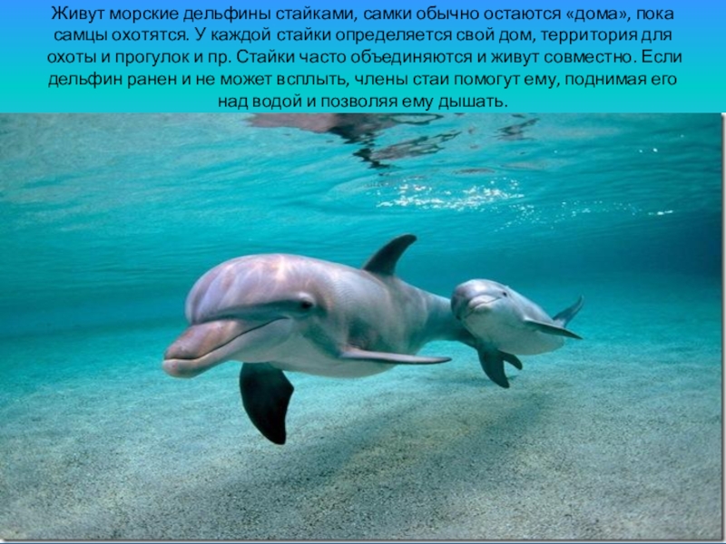 Слайд 14Живут морские дельфины стайками, самки обычно остаются «дома», пока самцы охотятся.