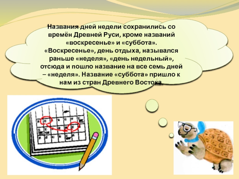 и «суббота». «Воскресенье», день отдыха, назывался раньше «неделя», «день недельный», отсюда и пошло название на все семь дней – «неделя». Название «суббота» пришло к нам из стран Древнего Востока.