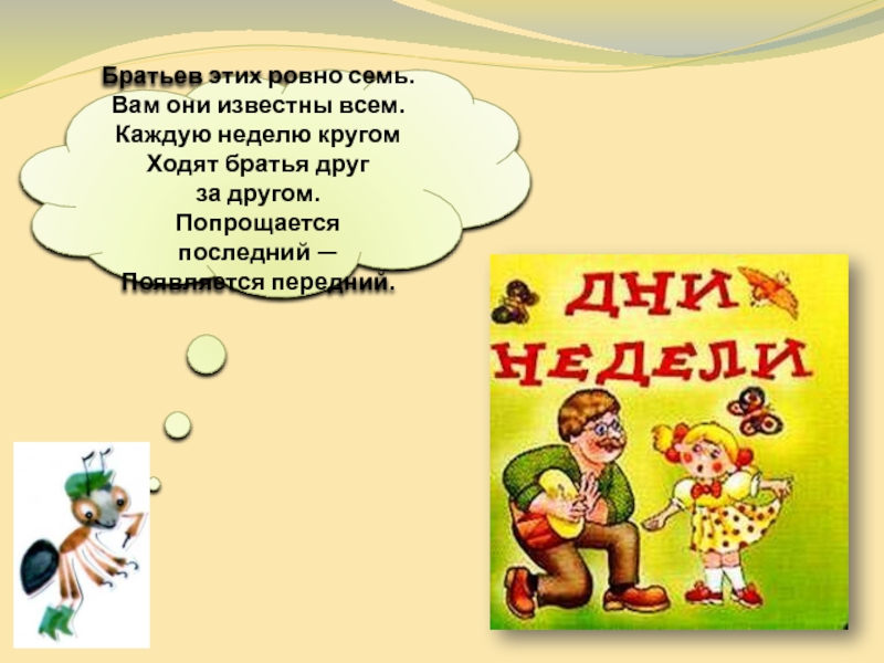 Братьев этих ровно семь. Вам они известны всем. Каждую неделю кругом Ходят братья друг