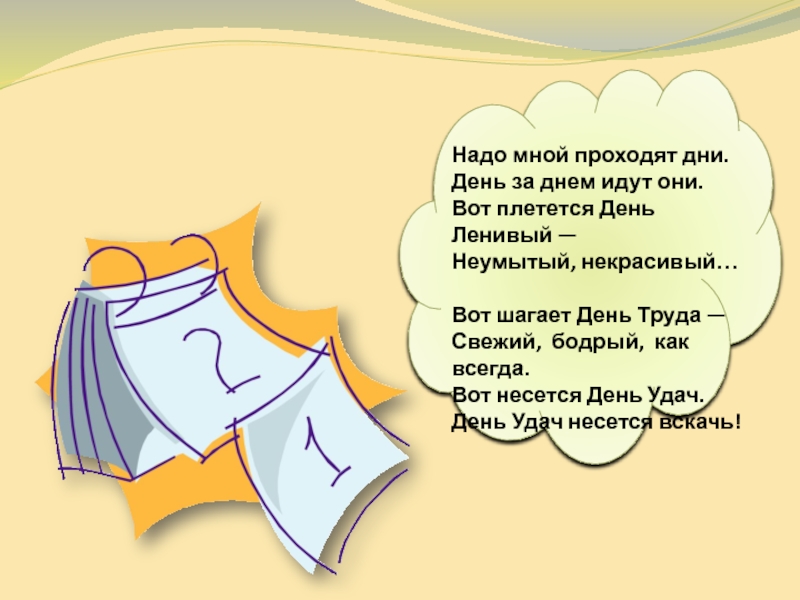 Надо мной проходят дни. День за днем идут они. Вот плетется День Ленивый — Неумытый, некрасивый… Вот шагает