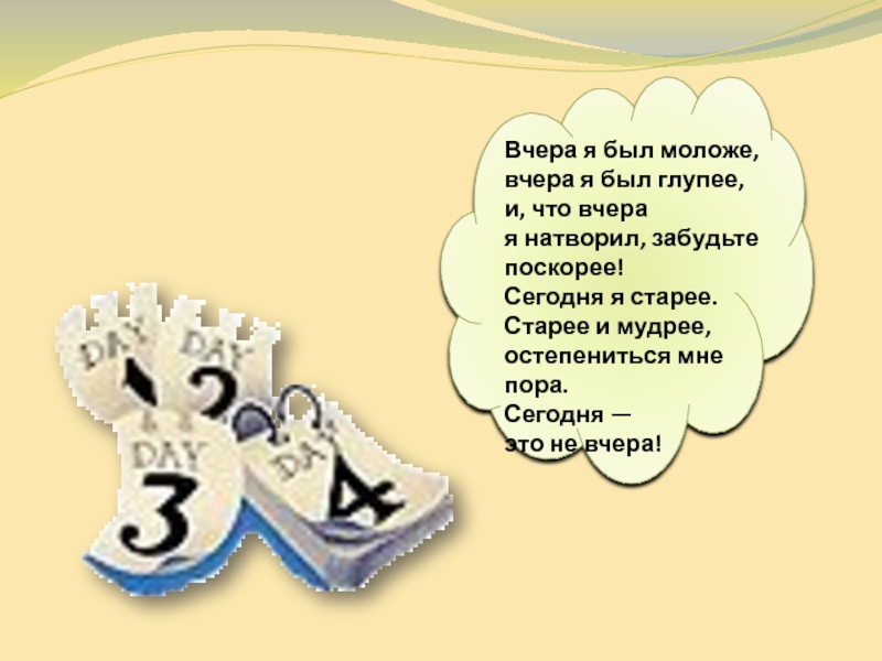 Вчера я был моложе, вчера я был глупее,  и, что вчера я натворил, забудьте поскорее! Сегодня я старее. Старее
