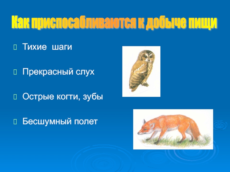 Тихие шаги Прекрасный слухОстрые когти, зубыБесшумный полетКак приспосабливаются к добыче пищи