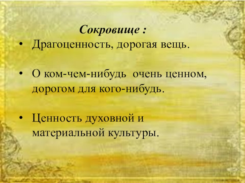 Сокровище :Драгоценность, дорогая вещь.О ком-чем-нибудь очень ценном, дорогом для кого-нибудь. Ценность духовной и материальной культуры.