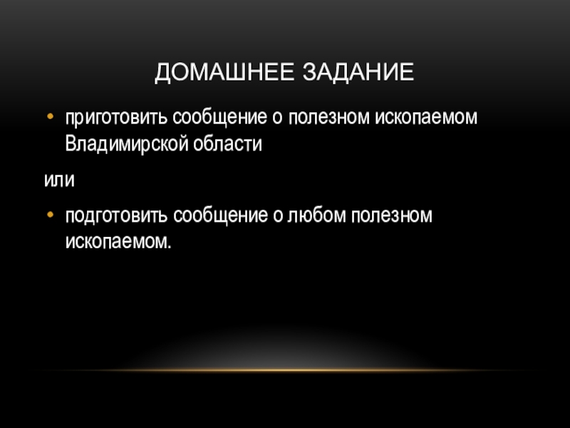Домашнее заданиеприготовить сообщение о полезном ископаемом Владимирской областиилиподготовить сообщение о любом полезном ископаемом.