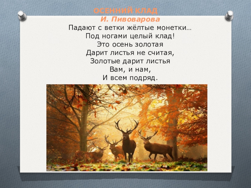 Слайд 3ОСЕННИЙ КЛАД И. Пивоварова Падают с ветки жёлтые монетки… Под ногами целый клад! Это осень